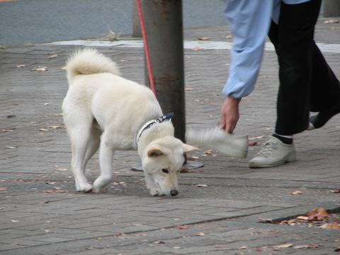 名前は「シロ」。飼い主を相当な力で引っ張って歩いてる。