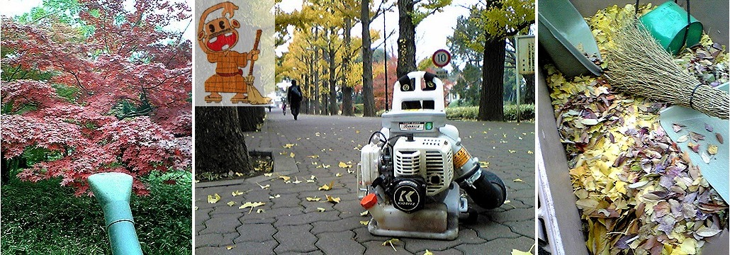 落ち葉清掃の仕事もあと少し。今日は初めておじさんが、エンジン式の