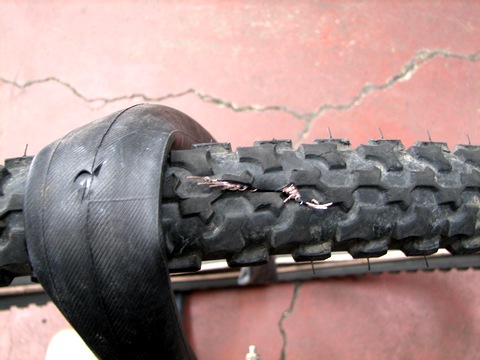 近くの自転車屋さんに持って行ったら、チューブだけじゃなくタイヤにも、