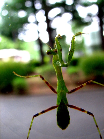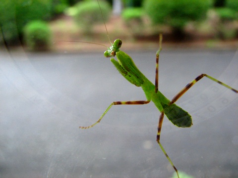 で、受付の窓にとまっていた、カマキリの子供の写真を撮る。