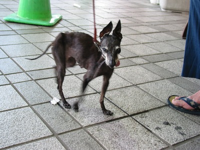 犬種は「トイ・マンチェスター・テリア」、名前は「ムン」(17歳のメス犬)。