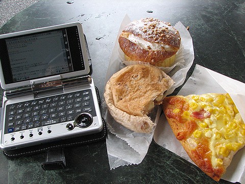 パン屋の店先でパンを食べる。2ちゃんねるの掲示板を見ながら。