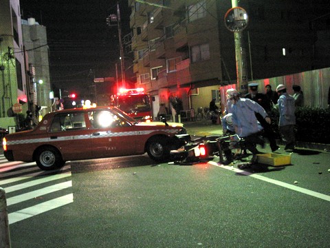 帰り道のT字路でタクシーと原付スクーターの事故。