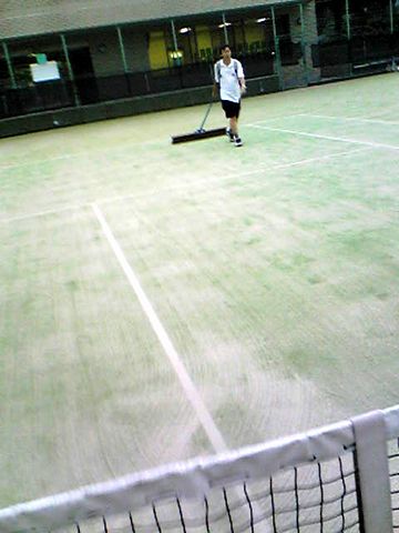 コートでブラシをかけるすずき君を携帯でパシャ。