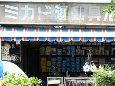 お店がある。道の反対側から望遠で「運動具店」を撮ったので、