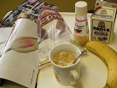 朝食はコーンフレークに牛乳かけて、あとバナナとオニオンサラダ。