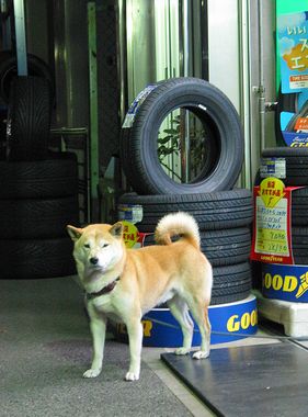 愛ちゃんを送って行って帰宅。帰り道にタイヤショップの看板犬をパチリ。