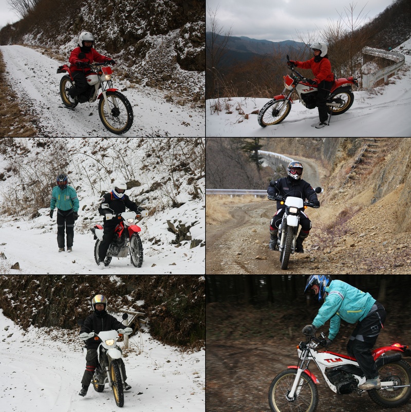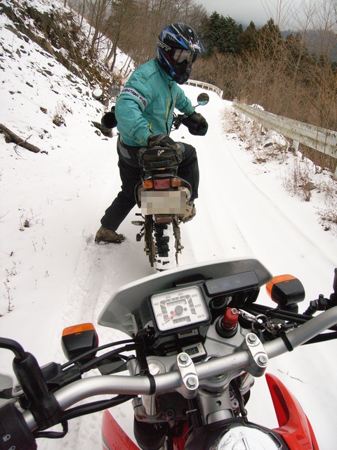 1/28 (水) 曇り 「雪道で 3度コケるも 無事生還(^_^)v」 以前(といっても四半世紀前)にトライアルバイクを指導してもらった 服部先生の林道スクールがあり、レンタルバイクで初参加する。 狭山市の笹井のマックで待ち合わせて、大名栗林道へ。 林道ですら何十年ぶりなのに、いきなり雪道とは難度が高い! でも、走ってると慣れてきて非常に楽しいo(@^◇^@)o いゃぁ~貴重な経験をさせてもらいました。