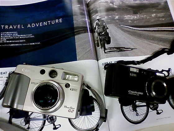 カメラの下の写真は、GIANTのカタログ。冒険家 関野吉晴氏が