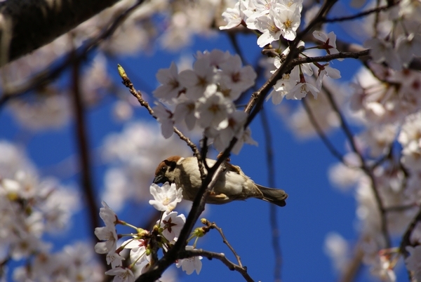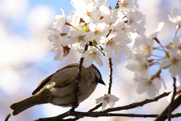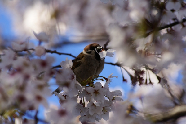 桜の花びらがパラパラ・クルクル落ちてくる。見上げるとスズメが